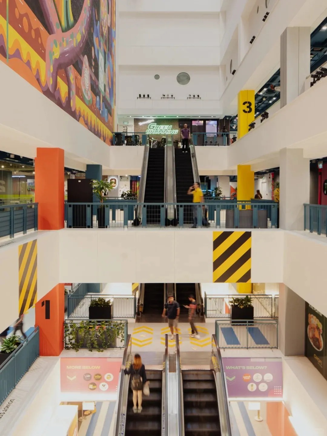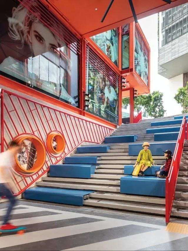 在空間優(yōu)化上,GRiD項(xiàng)目著重打造社交與活躍氛圍。通過(guò)引入“社交樓梯”理念,將傳統(tǒng)商鋪空間轉(zhuǎn)變?yōu)榧蓍e、交流與體驗(yàn)于一體的多元功能區(qū)。這些設(shè)計(jì)不僅增強(qiáng)了建筑的視覺(jué)吸引力和可識(shí)別性,還以鮮明的橙色、藍(lán)色及白色調(diào),為空間注入活力與現(xiàn)代感,使其在城市街角中獨(dú)樹(shù)一幟。